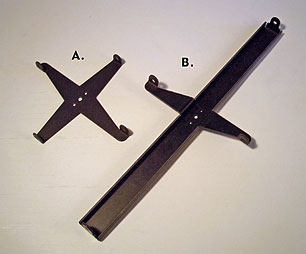 suspension system devised by Brooxes Compact Picavet Cross (A) is about as small as the X can go, and is standard on all Brooxes kits. With built-in eyes for the line, the BCPC at its simplest requires no additional hardware except some means of attaching it to the flying line. If you want a more elegant, smoother Picavet, add PeKaBe ball-bearing blocks [below] by rotating the X 90 degrees and mounting the blocks on the built-in eyes. The Gent-X (B) is the result of James Gentles' testing of several variations of the Picavet cross. He found that the most rotationally stable was one that had a cross bar much longer than the fore-and-aft member. The Gent-X is best-suited for rigs for large cameras and/or auto-rotating panorama mechanisms. It must be used with PeKaBe blocks (or small split-rings) in order for the cross to be oriented in the proper direction. The Folding Picavet Cross (C), designed to make small compact autoKAP rigs even more compact. This one is supplied with a separating nylon washer and a hitch pin. Included